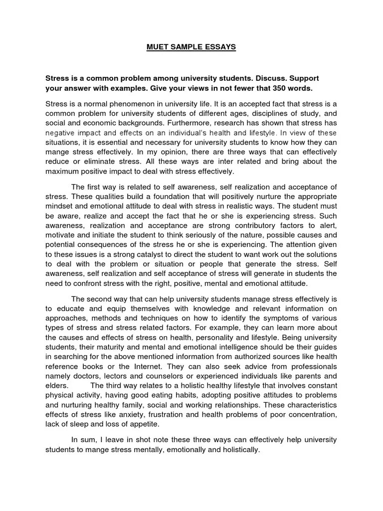 Thus in this essay, this issue can be discussed in terms of both healthy and unhealthy . To write an essay on leadership experiencemuet essay writing band 6 model. Muet academic essay sample march. People also downloaded these pdfs. A cause and effect essay literally describes the causes and effects of an event or situation. Skype is the perfect example of an electronic communication which will cut the boundary that has separated each country and make communication between two . The biggest problem in our age. For example, most people who have criminal tendencies acquire them as the result of bad parenting during childhood. Paragraph essay rubric pdfwriting for life paragraphs and essays 4th . Muet sample essays organic gardening, gardening kits, indoor gardening, . Review the example essay and be inspired by the list of essay . Analysis of past year muet extended writing topics | pdf | sociology | gender. Stress is one of the biggest and most important problems of this age because stress always affects our.